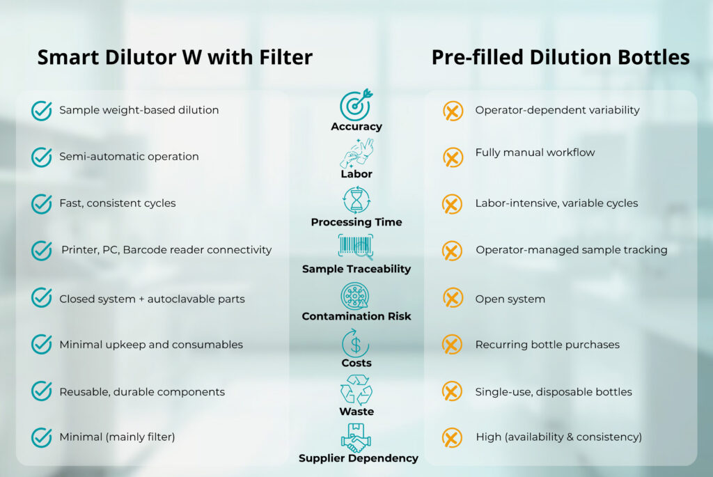 Comparison Table: Pre-filled Dilution Bottles vs. Smart Dilutor W with Filters